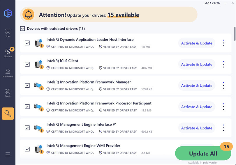 Click the Activate & Update button next to any flagged device or click Update All to update all the outdated drivers. You can sign up for the free trial to update drivers with no upfront cost.