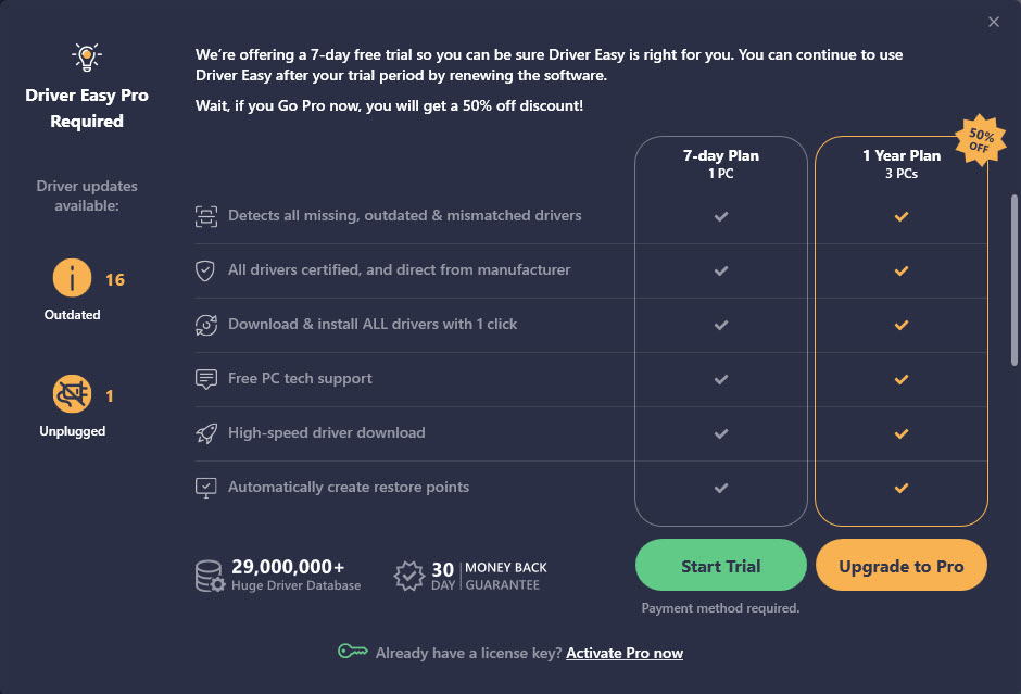 Optionally: You can click Start Trial to try Driver Easy Pro for free.