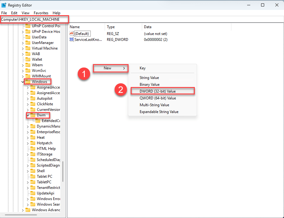 - Navigate to: HKEY_LOCAL_MACHINE\SOFTWARE\Microsoft\Windows\Dwm. Right-click on the right panel, choose New > DWORD (32-bit) Value.