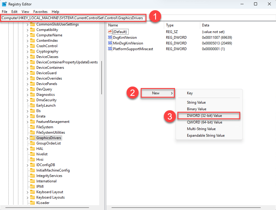 - Navigate to HKEY_LOCAL_MACHINE\SYSTEM\CurrentControlSet\Control\GraphicsDrivers. Then in the right panel, right-click an empty space, choose New > DWORD (32-bit) Value
