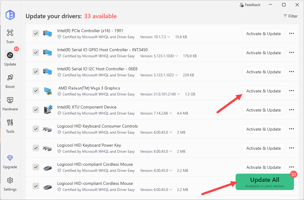 - Click Update All to automatically download and install the correct version of all the drivers that are missing or out of date on your system. Or you can click the Activate & Update button next to the flagged AMD Radeon Vega 3 graphics driver to automatically download the correct version of this driver, then you can install it manually. Either option will require a subscription. If you’re not ready for your purchase, sign up for a free trial to unlock all premium features without paying a dime.