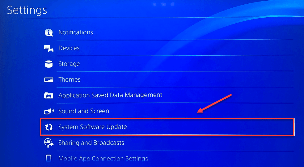 - Select System Software Update, and then follow the on-screen instructions to update the system software for your PS4.