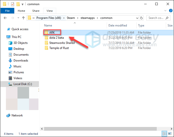 - Highlight the ARK folder, and then press the Del key on your keyboard to delete the folder.