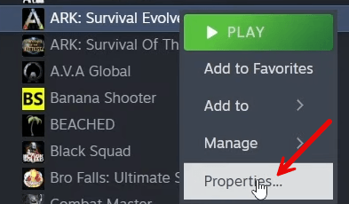 - In the LIBRARY, right-click ARK: Survival Evolved and select Properties from the drop-down menu.