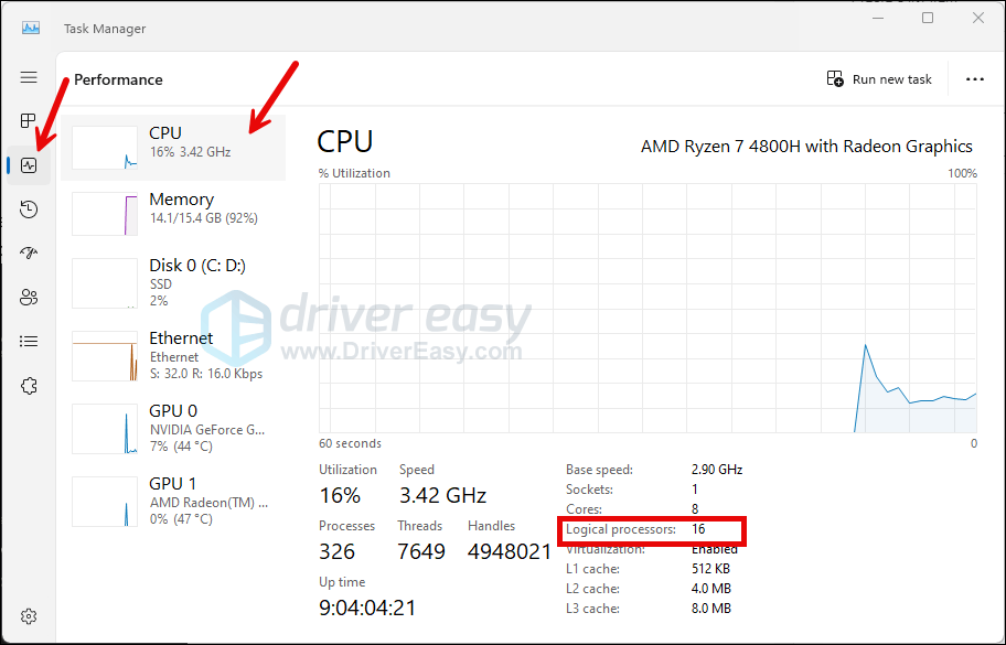 - Go to Performance > CPU, then check the Logical Processors number here. For instance, I have 16 here,