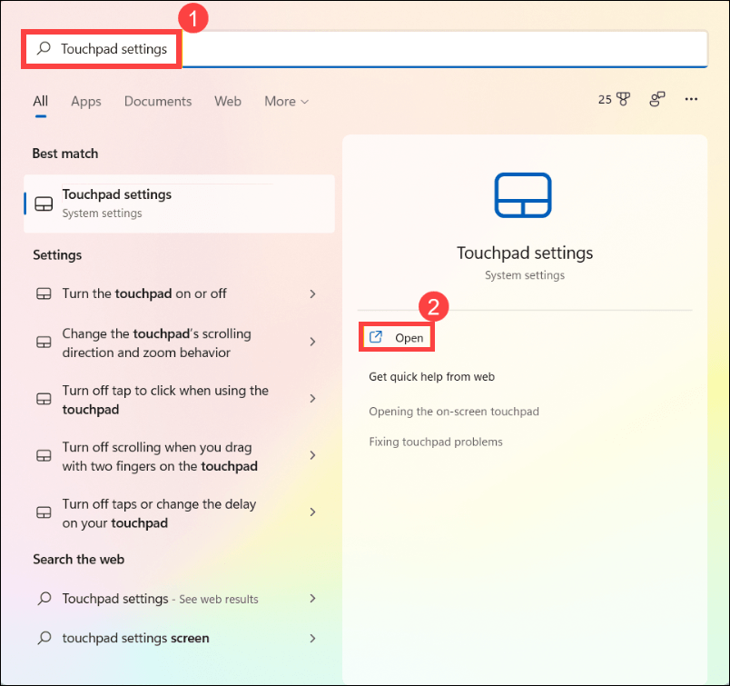 - In the Windows search bar, type and search Touchpad settings, then select Open.