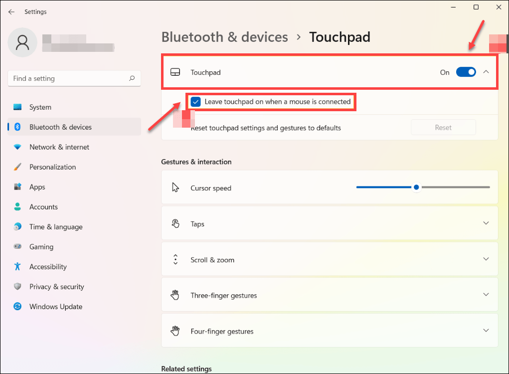 - Make sure the Touchpad function is toggled On. When your mouse is connected, ensure to check the box next to Leave touchpad on when a mouse is connected.