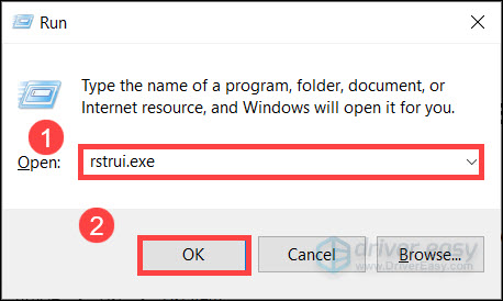 - On your keyboard, press Win+R together to invoke the Run box. Then type or paste rstrui.exe and click OK.