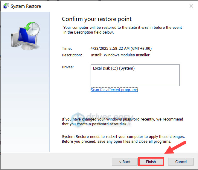 - By clicking Finish Windows will start the restoration process. Make sure you don’t have any unsaved documents.