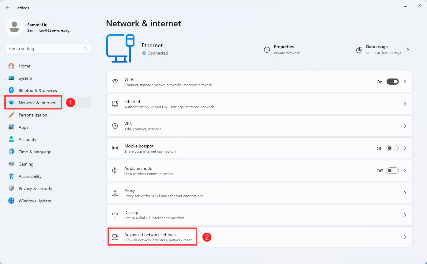 - From the left navigation panel, select Network & internet. Click Advanced network settings.