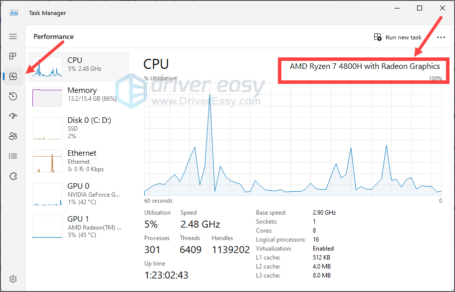 - Click the second icon (Performance), then select CPU, and you’ll see your CPU name there.