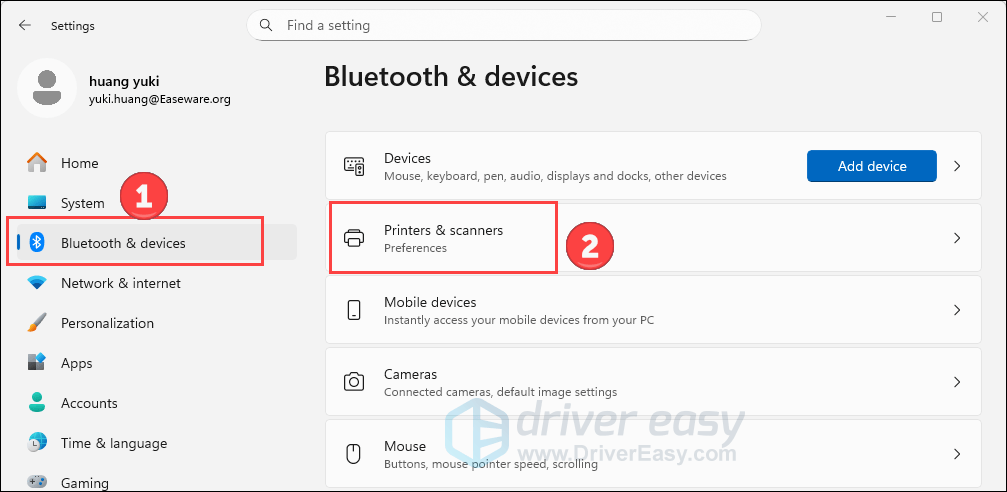 - Select Bluetooth & devices on the left and click Printers & scanners on the right.