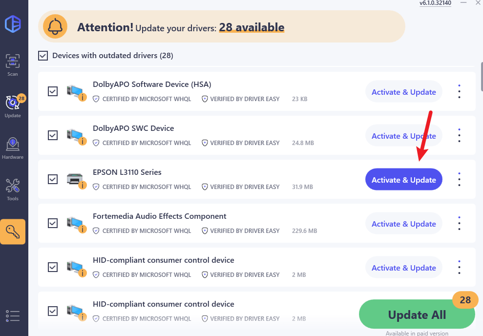 - Click the Activate & Update button next to the flagged device to automatically download and install the correct version of this driver.