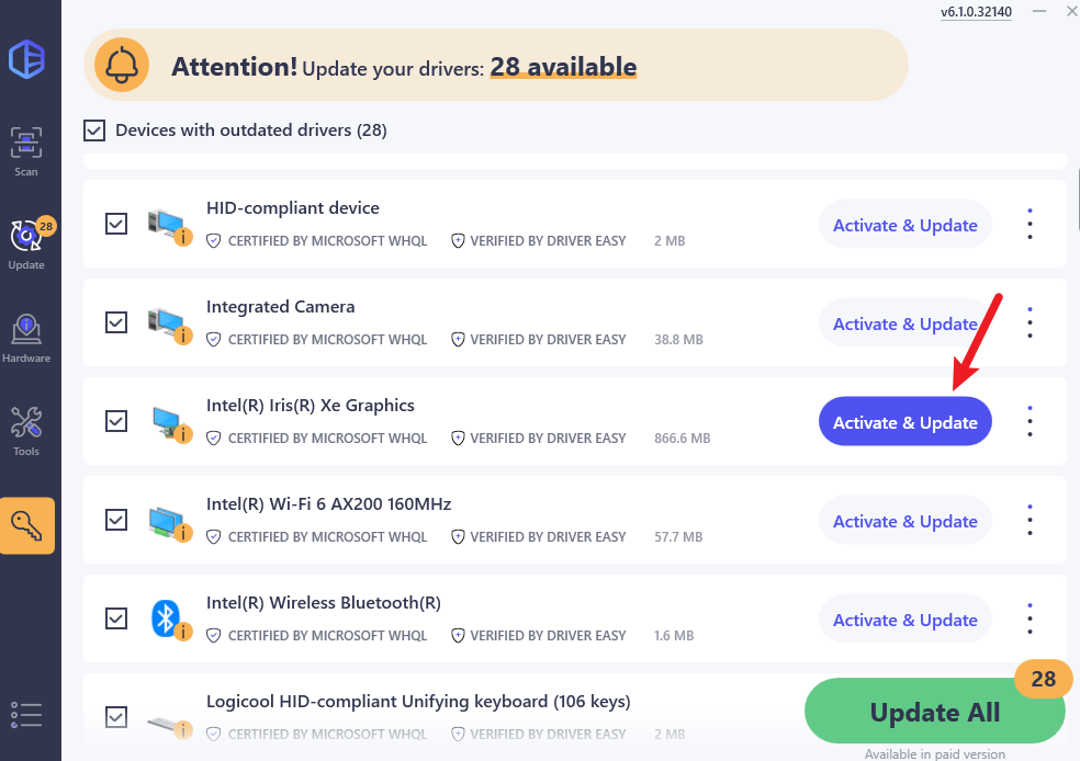 - Click the Activate & Update button next to the flagged device to automatically download and install the correct version of this driver.