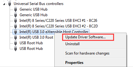 - Expand the Universal Serial Bus controllers category and find Intel® USB 3.0 eXtensible Host Controller. Note if the driver is missing or corrupted, you will see a yellow mark next to the device. Probably, the device name will be “Unknown USB Device”.