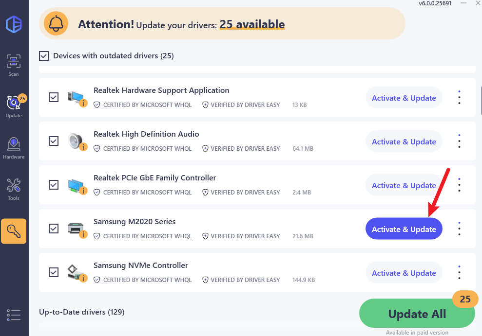3. Click the Activate & Update button next to the flagged device to automatically download and install the correct version of this driver.
