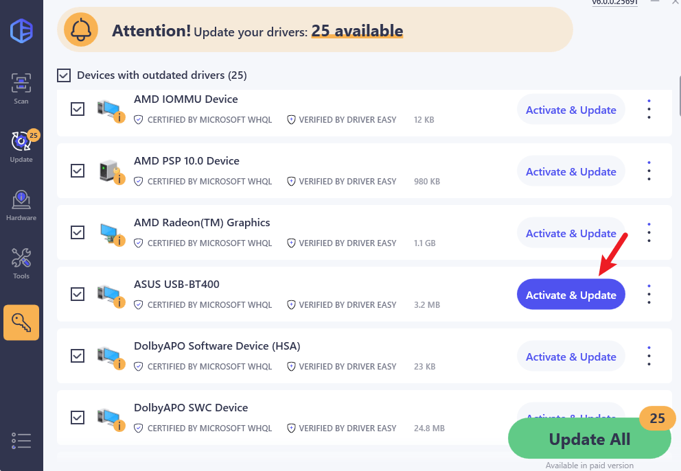 - Click the Activate & Update button next to the flagged device to automatically download and install the correct version of this driver.