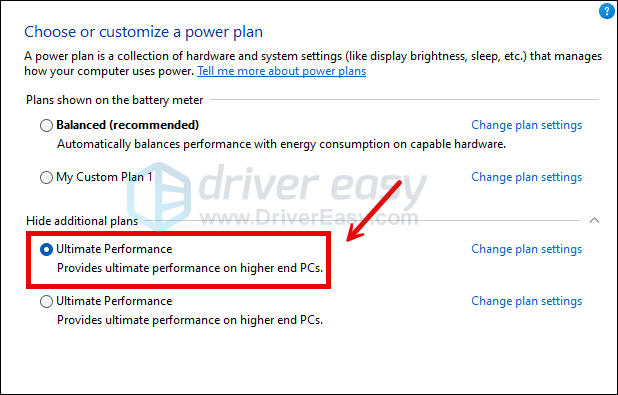 - In the pop-up window, expand Show additional plans and select Ultimate Performance.