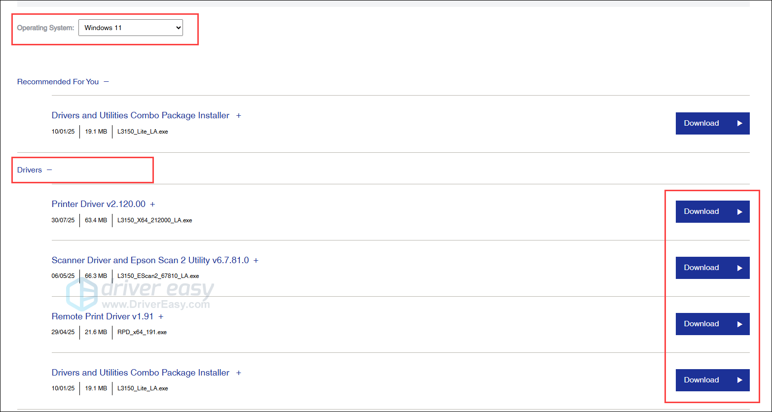 If you don’t have the time, patience or computer skills to install your L3150 drivers manually, you can do it automatically with Driver Easy. Driver Easy will automatically recognize your system and find the latest correct drivers for your exact printer, and your Windows version, and it will download and install them correctly: