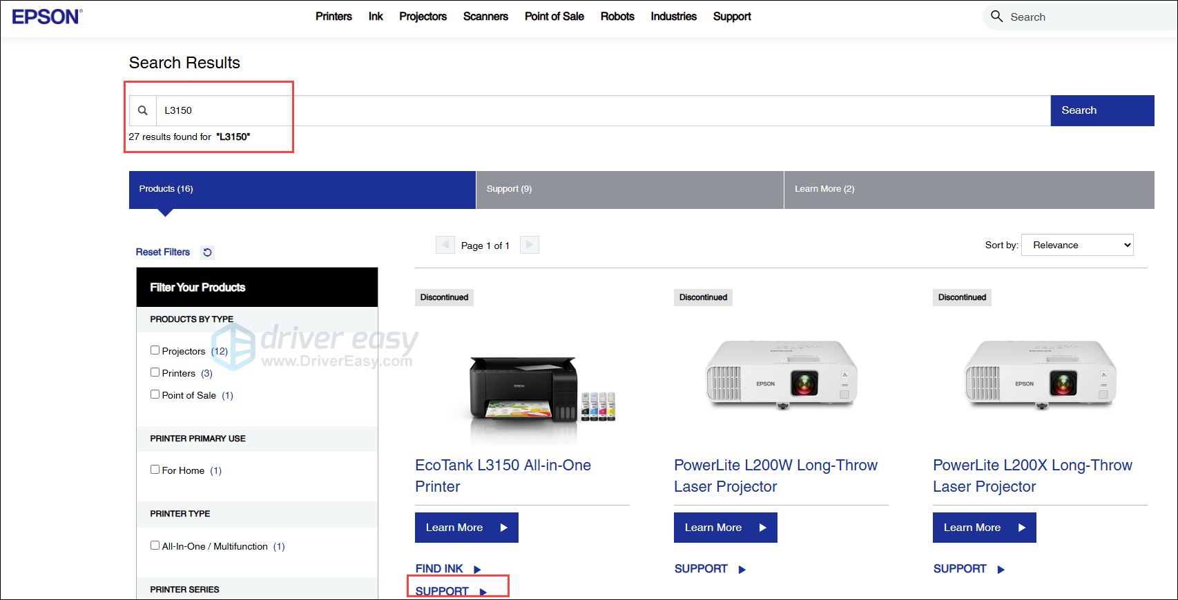 - In the search results, find Epson L3150 and click get SUPPORT.