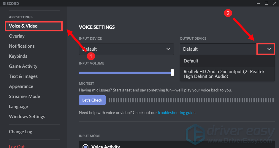 - On the left pane, select Voice & Video. Under the OUTPUT DEVICE section, click on the down arrow and select your output device instead of Default.
