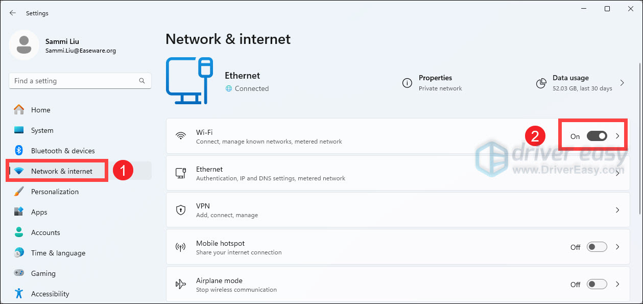 - From the left navigation panel, click Network and Internet. Toggle On Wi-Fi.