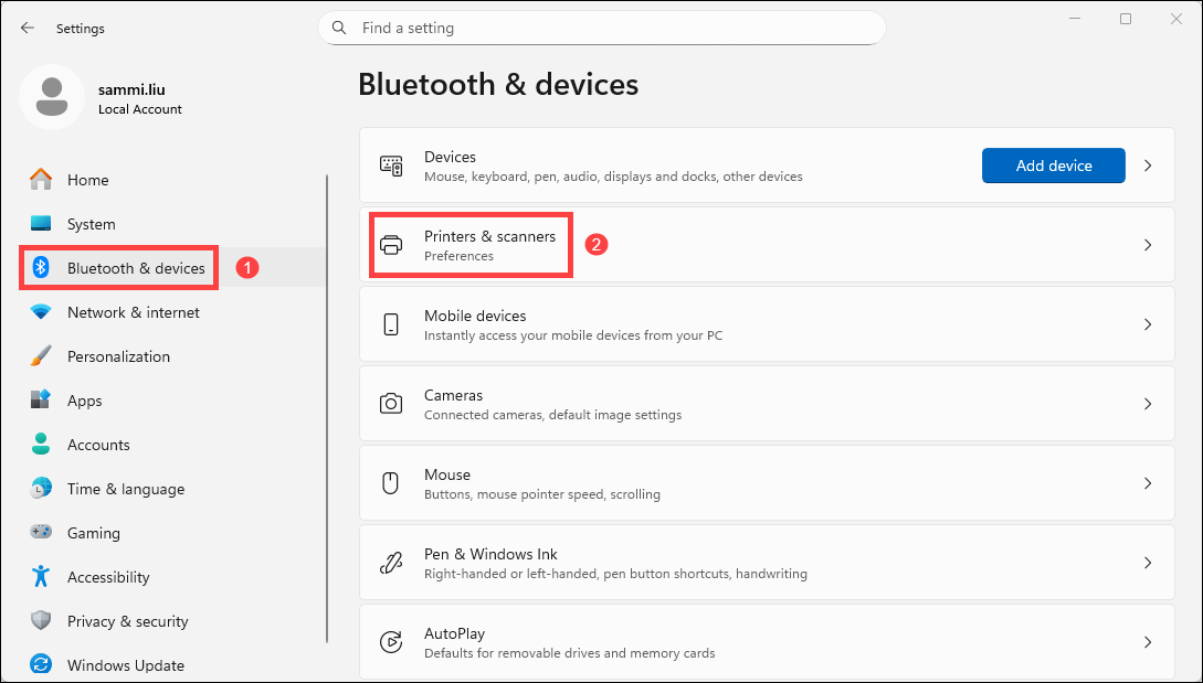 Select Bluetooth & devices > Printers & scanners.