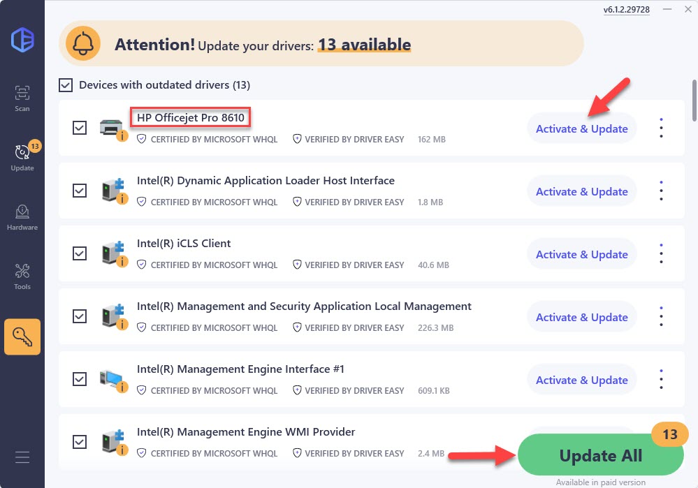 Click Activate & Update next to your device name. Or click Update All to update all drivers at once. You’ll be prompted to upgrade by clicking on these buttons. If you’re not ready for your purchase, sign up for the free trial to update drivers with no upfront cost.