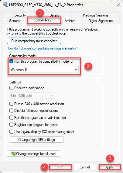 If you’re running an older version of Windows or your Canon LBP2900B driver isn’t installing properly due to compatibility issues, using Compatibility Mode can help. This allows you to install the driver as if you were running an earlier version of Windows, which can be useful if the official driver isn’t playing well with your current system.