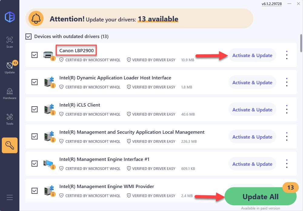 - Check if your Canon LBP2900B driver is flagged in the scan results. If it is, click Activate & Update to start a 7-day free trial or upgrade to Driver Easy Pro. Either option will automatically download and install the latest printer driver for you.