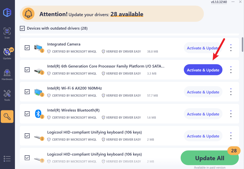 - Click the Activate & Update button next to the flagged device to automatically download and install the correct version of this driver.