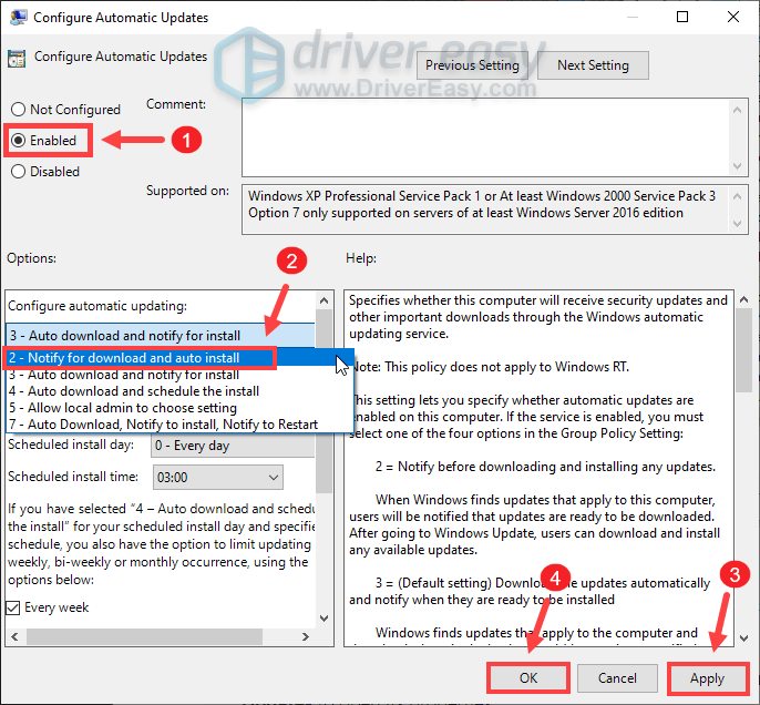 - Select the Enabled option. Under Configure automatic updating, select the second option Notify for download and auto install. Then click Apply > OK.