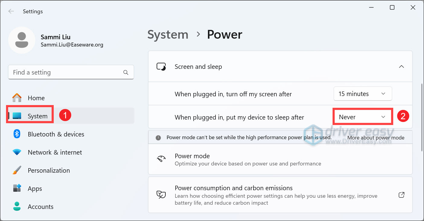 - Select System from the left panel. Click on the down arrow icon next to Screen and sleep. Then make sure you select Never for When plugged in, put my device to sleep after.
