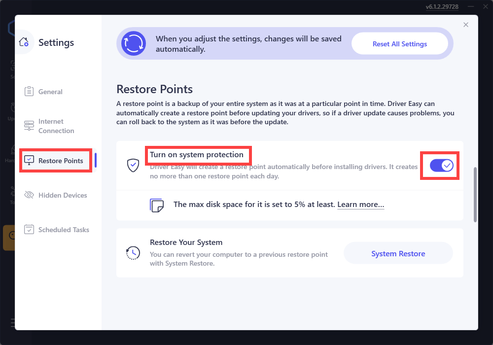 Additionally, Driver Easy can automatically create a restore point before performing tasks, which is a prudent step to safeguard your system by allowing you to revert to a previous state if any issues arise during the process. Below are the instructions to view and modify the settings about this feature, as well as detailed steps to roll back to a previous driver: