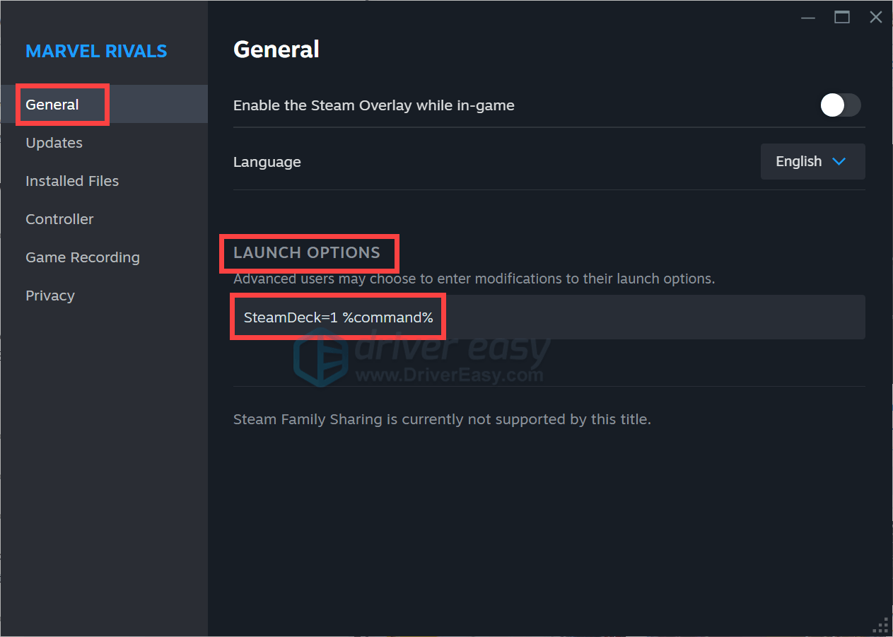 - Select the General tab. Under LAUNCH OPTIONS, type SteamDeck=1 %command%. Then close the window and load into your gameplay.