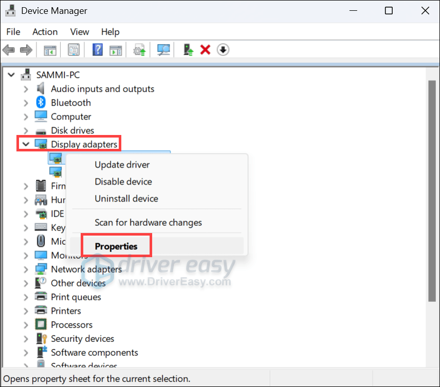 - Expand the Display adapters section, and right-click your graphics card and choose Properties.