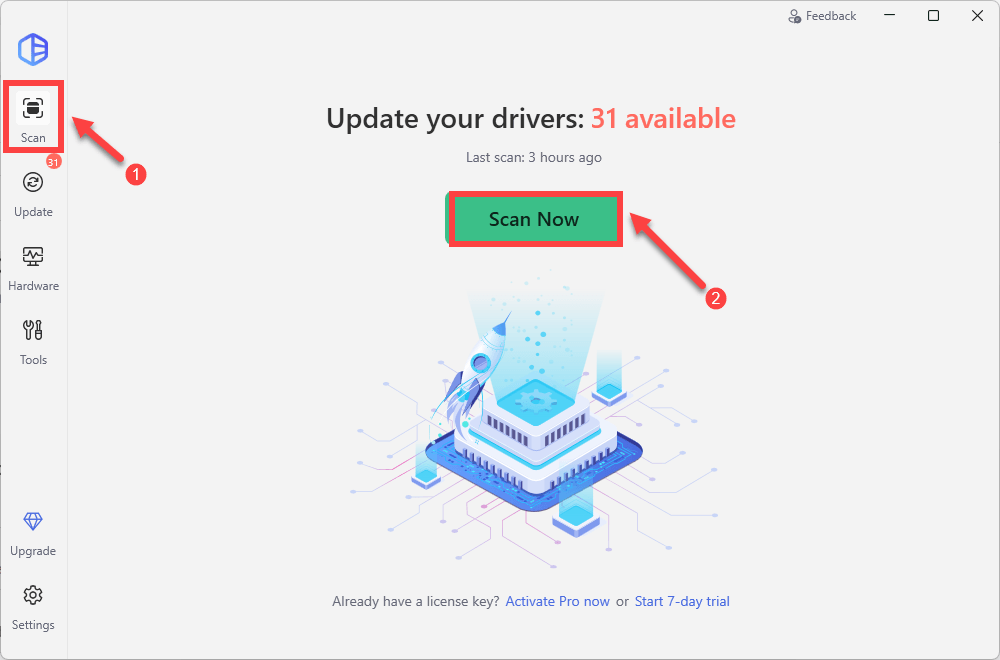 - Now from the left navigation panel, select Scan. Then click on the Scan Now button and it will automatically detect if there are any missing or outdated drivers on your system, as well as any missing important system components such as Microsoft Visual C++ Redistributable packages.