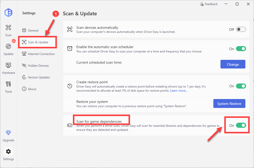 - Select Scan & Update, then toggle on the option Scan for game dependencies.