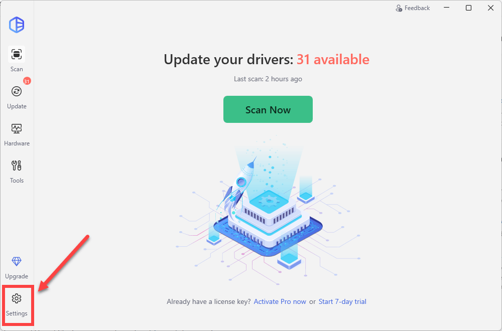 - Launch Driver Easy. In the bottom left corner, click on Settings.
