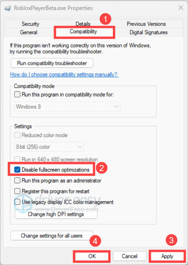 Fullscreen optimization is a Windows feature that blends exclusive full-screen with borderless windowed mode. However, it may sometimes cause lagging and even crashes in games. You can try disabling it to see if Roblox works properly.
