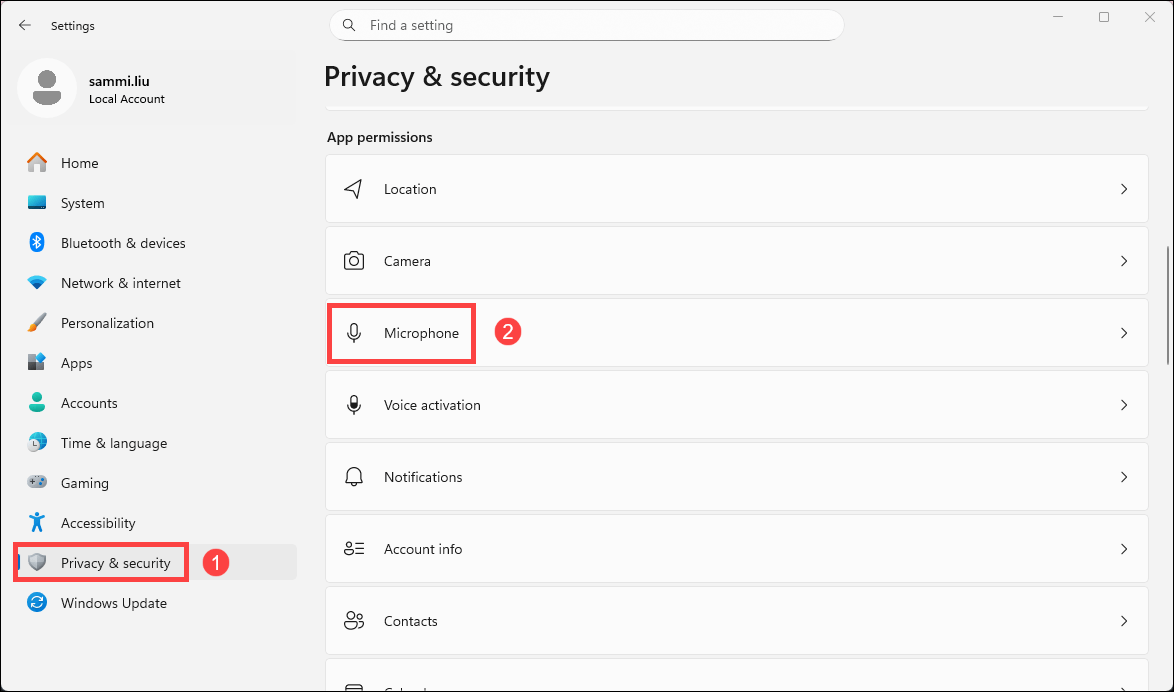 3) Select Microphone on the left pane. Then, click the Change button, and make sure Microphone access for this device is turned on.