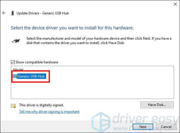 - Check the box next to “Show compatible hardware” and select Generic USB Hub. Click on Next button.