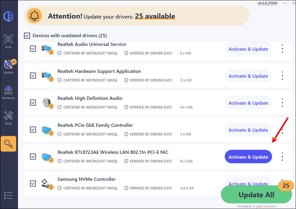 - Click the Activate & Update button next to the flagged device to automatically download and install the correct version of this driver.