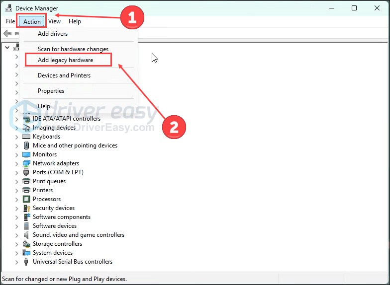 - On the menu bar, click Action > Add legacy hardware > Next.