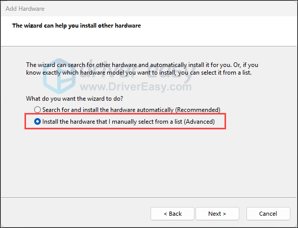 - Select Install the hardware that I manually select from a list (Advanced), and click Next.