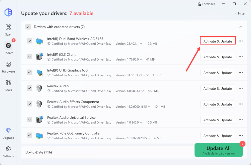 - Click the Activate & Update button to update your wireless adapter driver. Or click the Update All button to automatically update all the drivers. (This requires the Pro version — you will be prompted to upgrade when you click Update All. You get full support and a 30-day money-back guarantee.)