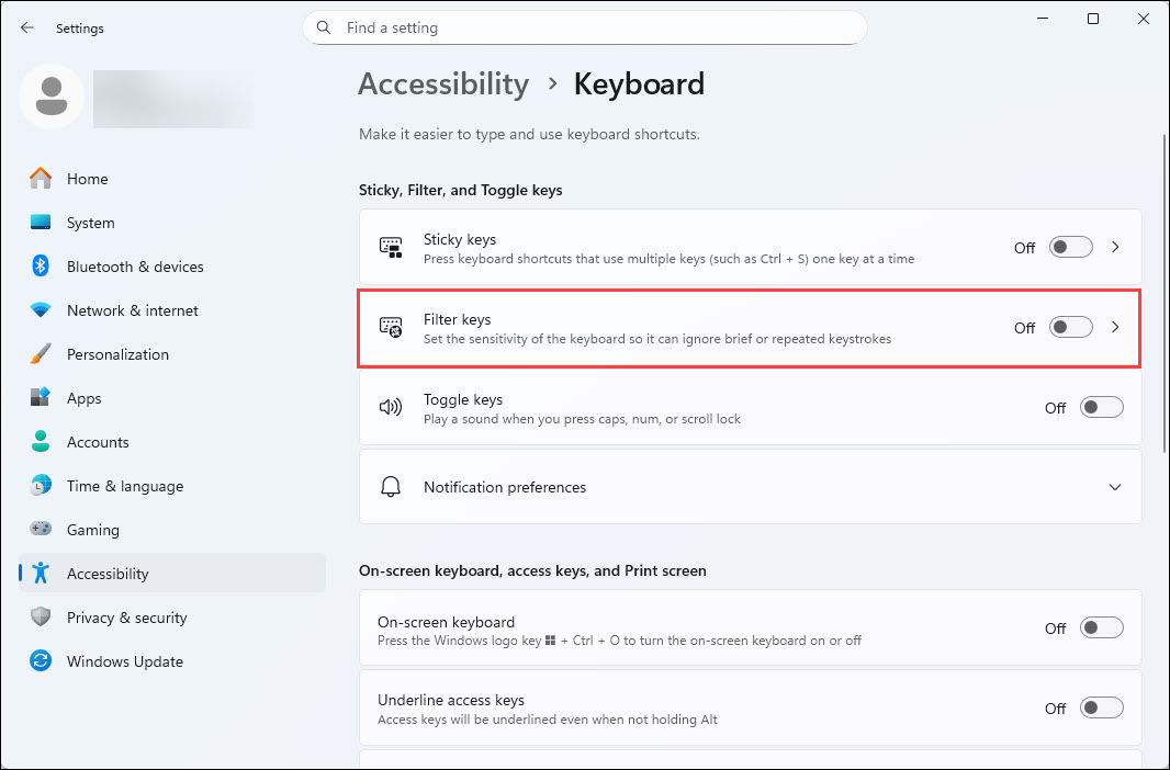 Windows has a setting, called Filter Keys, that allows you to control how it deals with accidental repeated keystrokes. Unfortunately, if turned on, this setting has been known to cause some keyboards to stop working in Windows 10/11. So you should check if it’s turned on. If it is, you should turn it off and see if that resolves the problem.