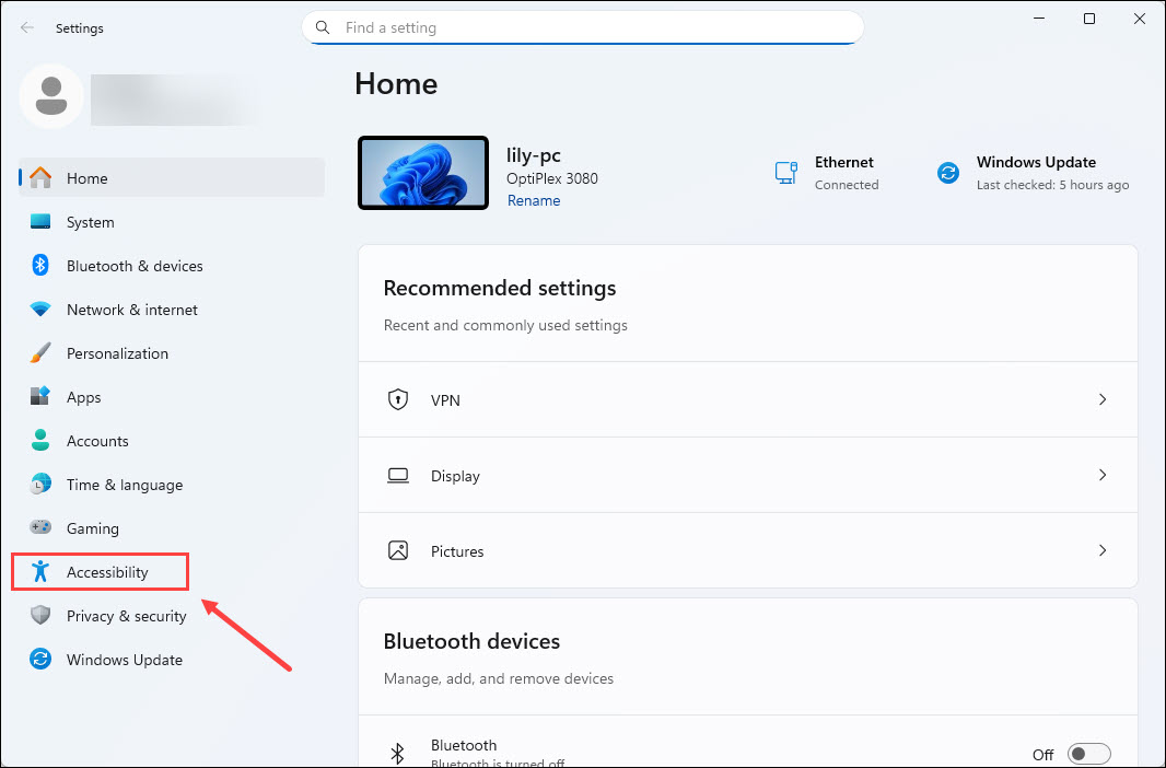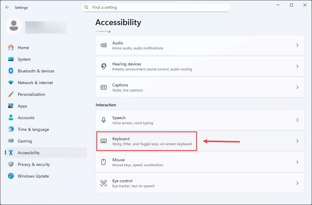 - On your keyboard, press the Windows key + I at the same time to open Settings. Then click Accessibility.