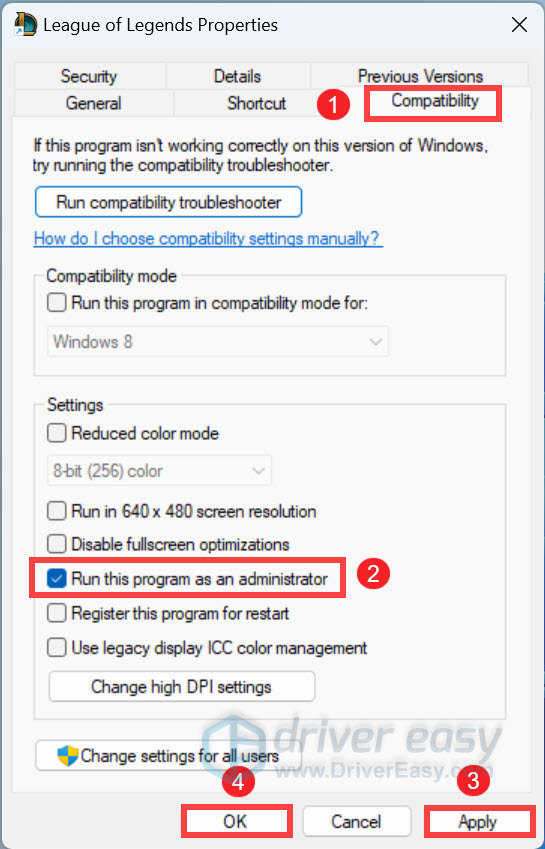 - Click on the Compatibility tab and check the box next to Run this program as an administrator. Then click Apply > OK.