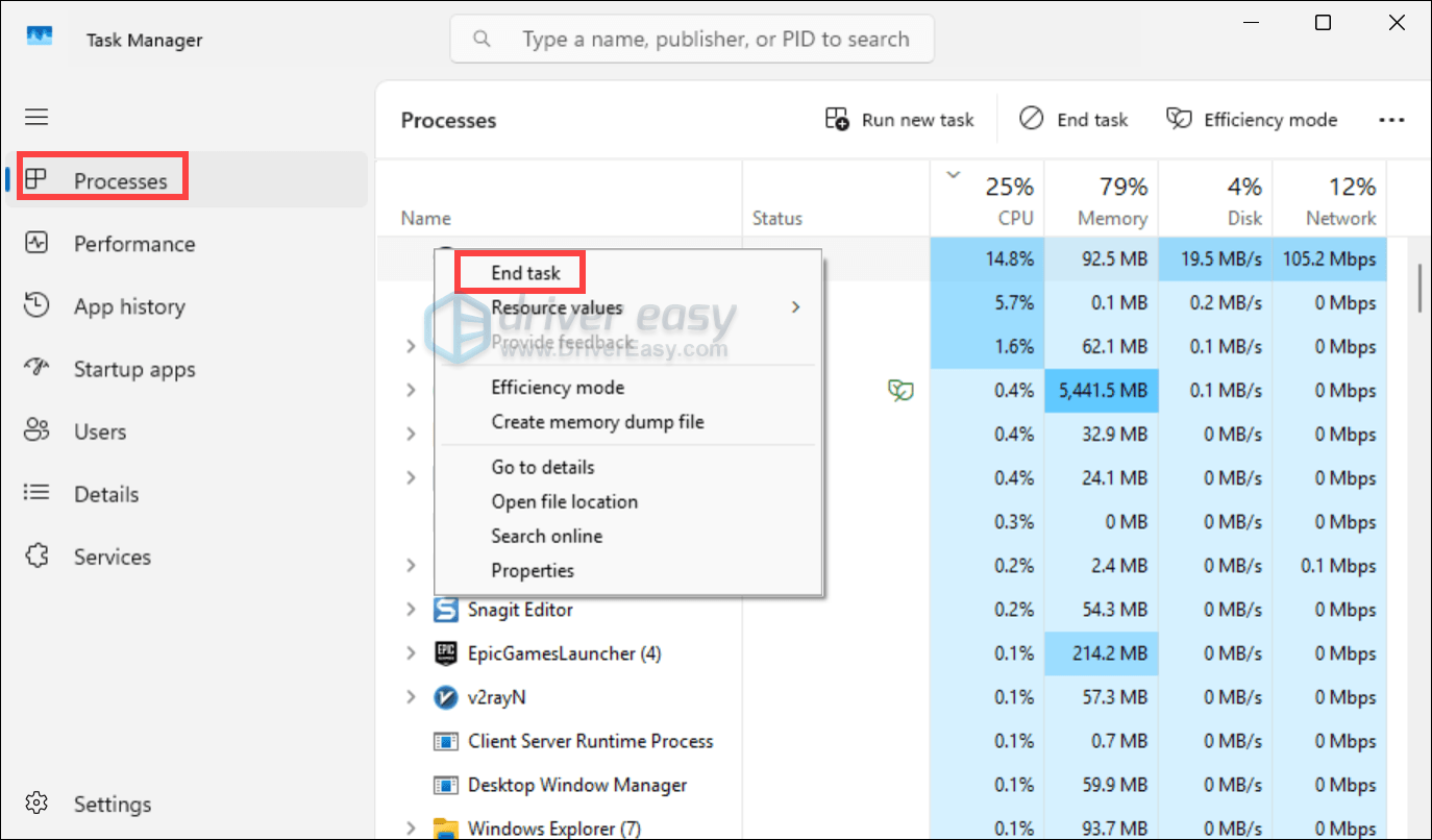 - Go to the Processes tab. Look for any non-essential or resource-intensive programs. Right-click on each of them and select End task.